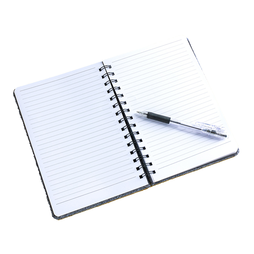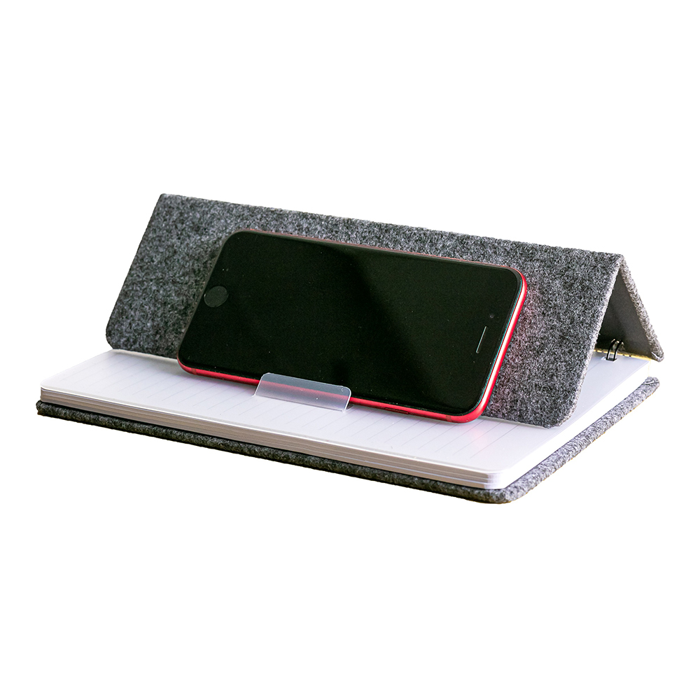 スマホスタンドにもなる、再生紙利用のエコなノート。使いやすいA5サイズ。ページ数:約80枚。